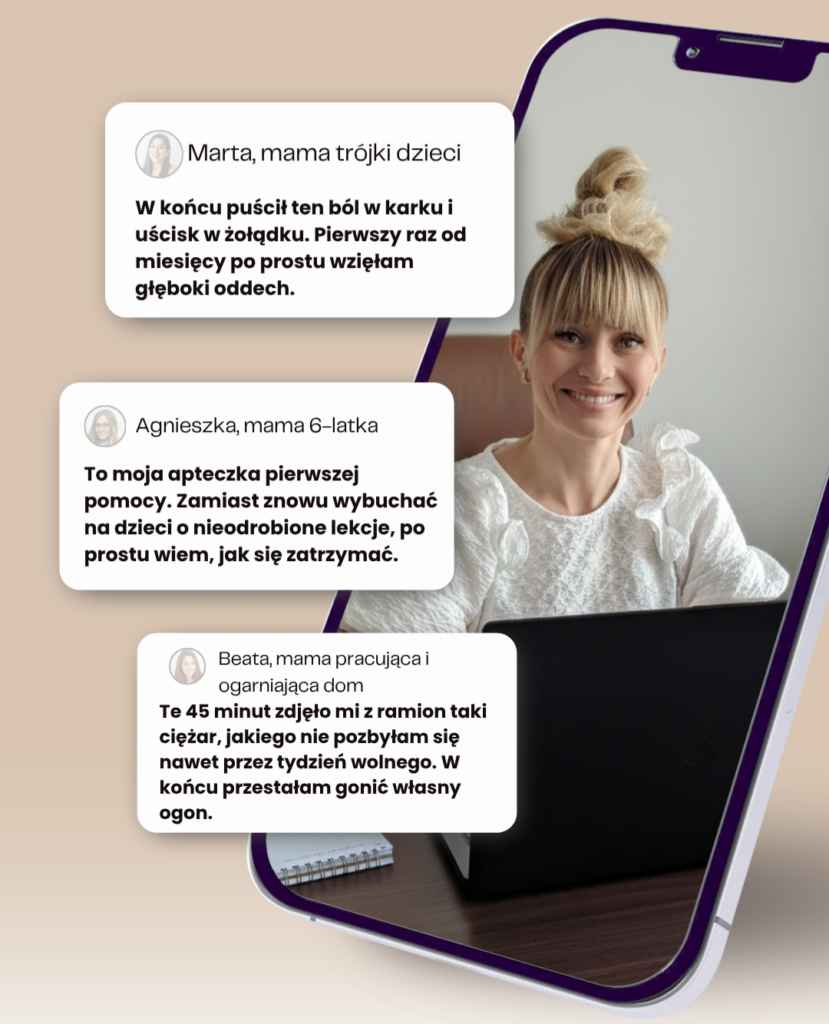 Zdejmiemy z Twoich barków ciężar bycia idealną. Przestaniesz czuć się gorsza, patrząc na inne mamy w internecie. Odzyskasz pewność, że jesteś dokładnie taką mamą, jakiej potrzebują Twoje dzieci – mimo zmęczenia.